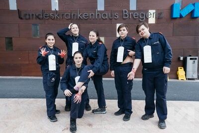 Um für den Ernstfall gewappnet zu sein, führen Einsatzkräfte regelmäßig Übungen mit simulierten Ernstfällen durch. Der Ort des Geschehens wird gewählt, die Übung von langer Hand geplant. Ziel ist es, dass die Übung möglichst reibungslos läuft, dass alle Einsatzkräfte ihre Aufgaben im Notfall trainieren können und dass die Gegebenheiten vor Ort bekannt sind. Gleichzeitig dient eine Übung auch zur Evaluierung, ob es bei bestimmten Abläufen und Prozessen noch Verbesserungen für den tatsächlichen Ernstfall bedarf. Ein solches Notfalltraining fand nun am Montag, 09. April 2018, am Abend in Zusammenarbeit mit der Feuerwehr Bregenz Stadt, dem Roten Kreuz Bregenz, dem Team des Notarztwagens (NAW) des LKH Bregenz sowie Flugplatzbetriebsleitung und Brandschutzbeauftragte des Landeskrankenhauses Bregenz statt. Insgesamt waren 100 Personen im Einsatz, die Verletzten waren Statisten der Jugendfeuerwehr Bregenz Stadt und sogar professionell „geschminkt“.