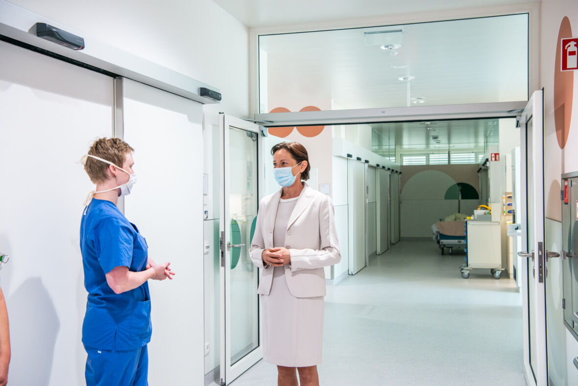 Die neuen Räumlichkeiten für die Geburtshilfe und die Kinderintensivmedizin am LKH Feldkirch wurden aufgrund der Corona-Situation in sehr kleinem Rahmen eröffnet. Drei moderne Kreißsäle und ein OP speziell für Kaiserschnitte sind das Herzstück der neu gestalteten Entbindungsräumlichkeiten. Auf der Kinderintensivstation stehen 12 Betten mit den höchsten technischen Standards zur Verfügung. „Tür an Tür sorgen die beiden medizinischen Fächer für die ideale Versorgung der jüngsten Patientinnen und Patienten“, betonen die beiden Primarii: DDr. Burghard Abendstein, Leiter der Gynäkologie und Geburtshilfe und Univ. Prof. Dr. Burkhard Simma, Leiter der Kinder- und Jugendheilkunde. Landesrätin Martina Rüscher gratulierte zur neu gestalteten Infrastruktur im Schwerpunktkrankenhaus Feldkirch.