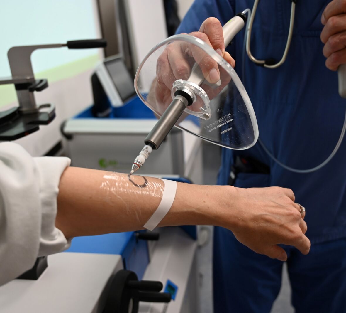Auch die neue Rhenium-Therapie wird am LKH Feldkirch interdisziplinär, in Zusammenarbeit mit der Abteilung für Nuklearmedizin durchgeführt und stellt eine spezielle Form der Strahlentherapie dar. Sie ist in erster Linie für Patient:innen gedacht, bei denen eine Operation von weißem Hautkrebs nicht oder nicht mehr möglich ist. Ursache dafür kann unter anderem sein, dass bereits mehrere Operationen an derselben Stelle durchgeführt wurden und das Gewebe einen neuerlichen Eingriff nicht mehr tolerieren würde. Auch hohes Alter und der medizinische Ausschluss anderer Therapieformen können Gründe für den alternativen Einsatz der neuen Rhenium-188-Therapie sein – etwa bei schweren Begleiterkrankungen oder wenn ein einschränkender bzw. entstellender Eingriff im Gesicht notwendig wäre, um den Krebs zu entfernen.
